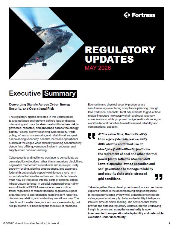Our May 2026 regulatory update covers the convergence of cyber, operational, and supply chain risk governance affecting utilities and critical infrastructure operators. The regulatory signals reflected in this update point to a compliance environment defined less by discrete rulemaking and more by structural shifts in how risk is governed, reported, and absorbed across the energy sector.